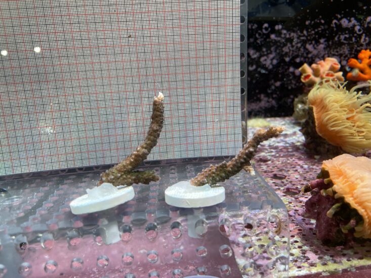 人間がお手伝い: 健康なサンゴのカケラを接着剤で岩に固定して、成長を助ける取り組みが行われているよ 。