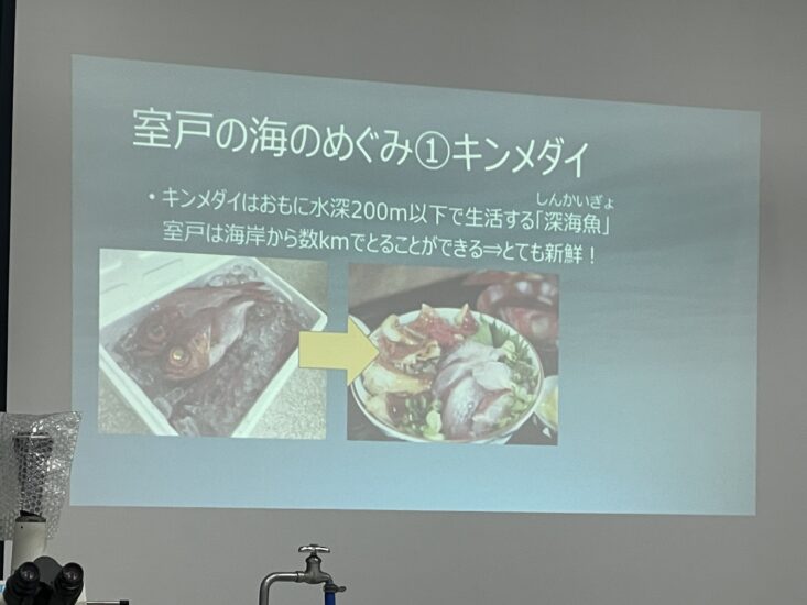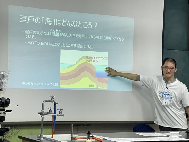 次に、地質専門員の工藤先生が室戸の海の特徴を教えてくれたよ 。 室戸の海の東側は、断層(だんそう)の影響で海岸からすぐ深くなる「急深(きゅうしん)」という地形なんだ 。だから、陸から近いところでキンメダイみたいな深海魚が獲れるんだって!すごいよね 。